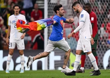 On Monday, a guy onto the field of play during a game at the Qatar World Cup while holding a rainbow flag...